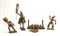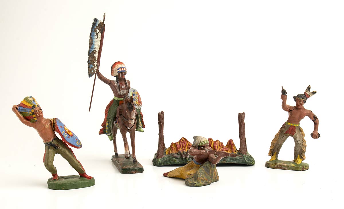 Lotto di 5 soggetti in diverse pose, figure di indiani pellerossa in azione di guerra, di cui uno a cavallo. Anteguerra, in composizione/pasta, con mancanze, rotture ed evidenti tracce d'uso, condizioni discrete. Altezza soldatini circa cm.7