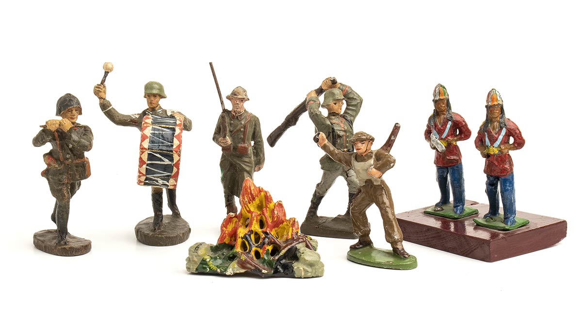 Lotto di 6 soggetti in diverse pose, indiani pellerossa in azione di guerra. Anteguerra, in composizione/pasta, con mancanze, rotture ed evidenti tracce d'uso, condizioni discrete. Altezza soldatini circa cm.7