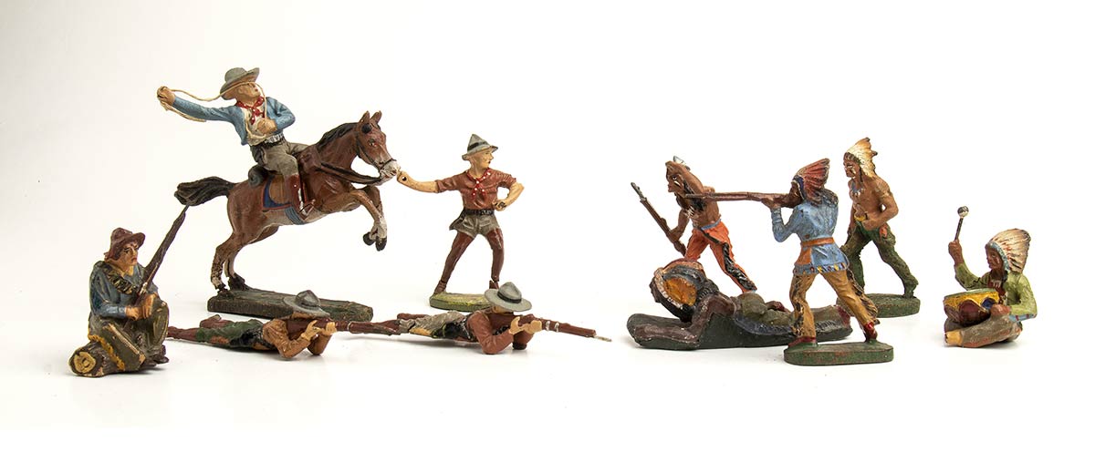 Lotto di 10 soggetti in diverse pose, figure di indiani pellerossa e Cow Boys in azione di guerra, di cui uno a cavallo. Anteguerra, in composizione/pasta, con mancanze, rotture ed evidenti tracce d'uso, condizioni discrete. Altezza soldatini circa cm.7
