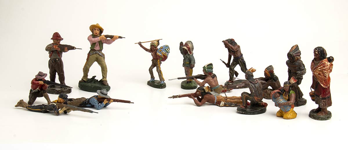 Lotto di 15 soggetti in diverse pose, figure di indiani pellerossa e Cow Boys in azione di guerra. Anteguerra, in composizione/pasta, con mancanze, rotture ed evidenti tracce d'uso, condizioni discrete. Altezza soldatini circa cm.7