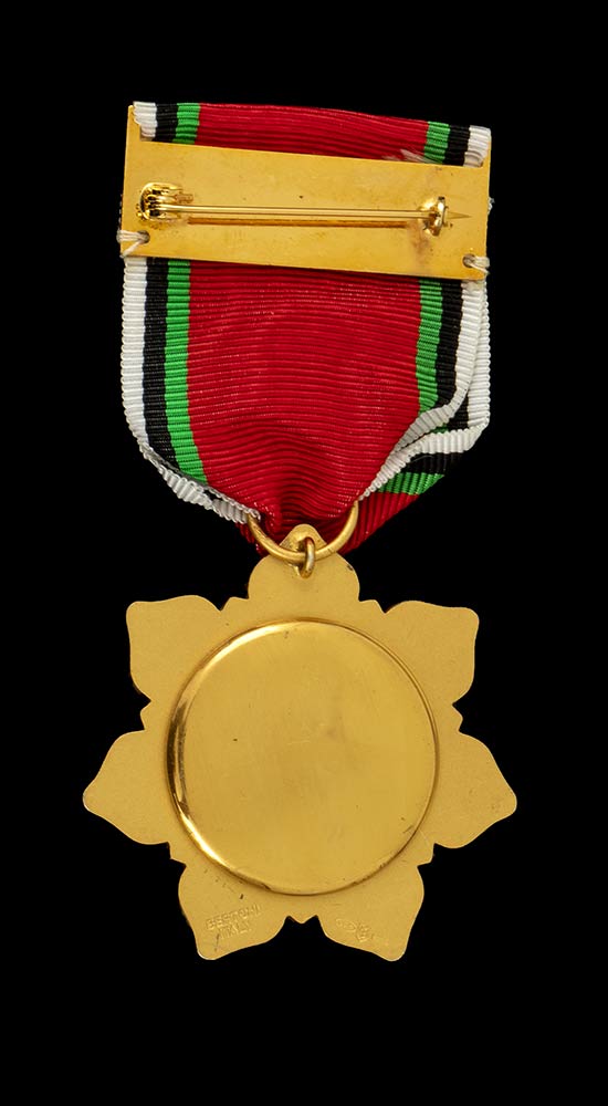 Decorazione da Cavaliere: argento, con dettagli in argento dorato; stella a sette raggi smaltati di bianco, con piccole palmette alla base, affinacati da brevi raggi smaltati di verde; medaglione centrale in smalto nero con applicato lo stemma di stato entro giro smaltato in rosso con iscrizione in calligrafia araba; verso satinato, con marchi del fabbricante e dell'argento, contromedaglione lucidato a specchio; appiccagnolo ad occhiello, anello passanastro circolare, nastro originale in seta con spilla per il fissaggio all'uniforme.