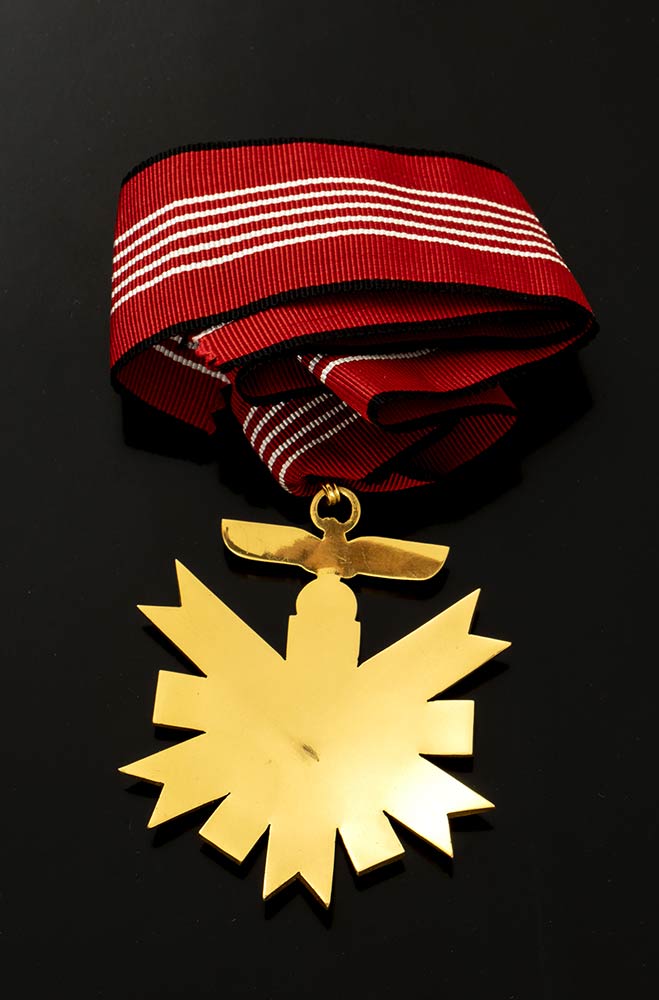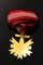 insegna di prima classe, bronzo dorato e smalti, completa di nastrino felatura allo smalto del braccio inferiore della croce altrimenti ottima, buone condizioni, 70X70 mm