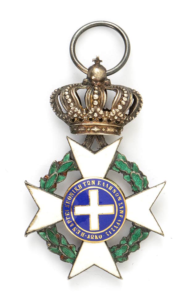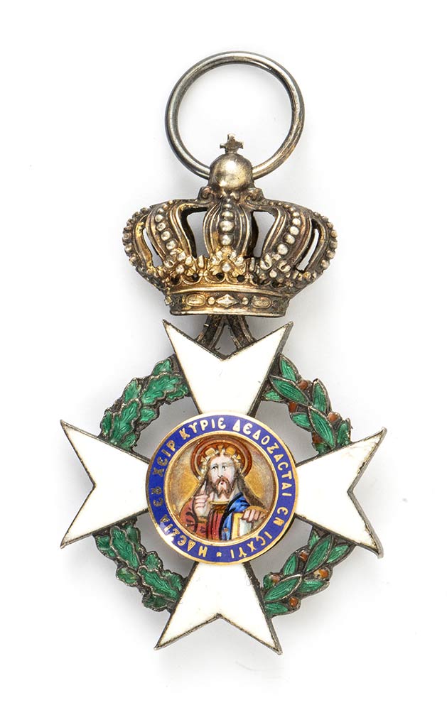 Ordine del Redentore, pendente da Cavaliere, inizi del XX secolo , in argento e smalti, con centro in oro. Preziosa lavorazione, smalto bianco danneggiato al braccio destro della croce su entrambi i lati. Misura dalla croce della corona mm.50x34 circa