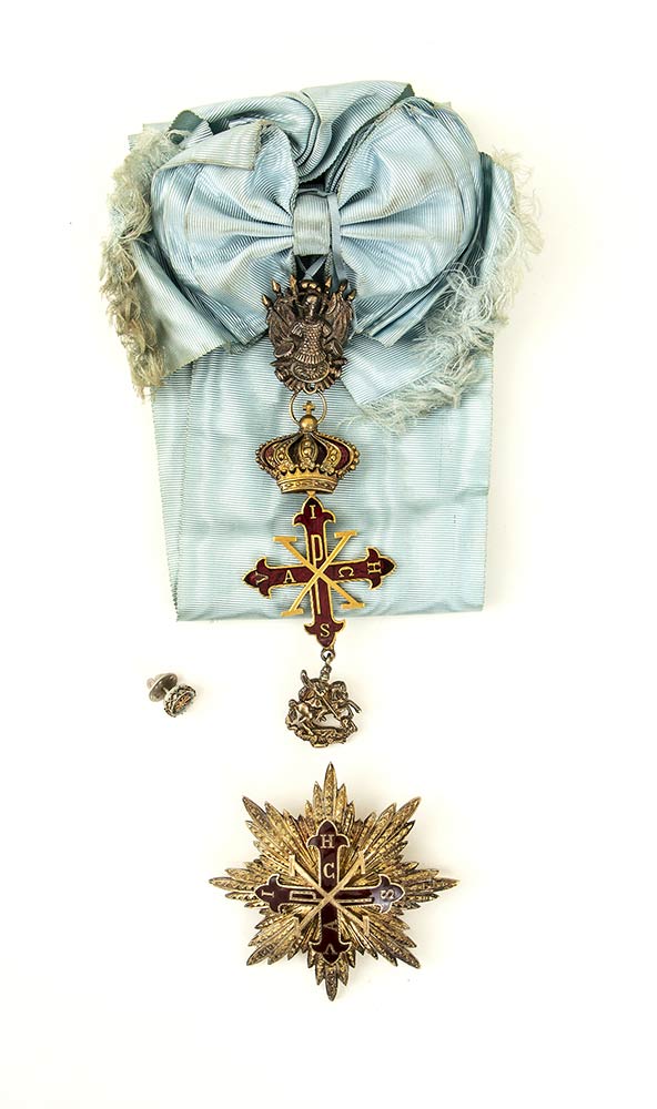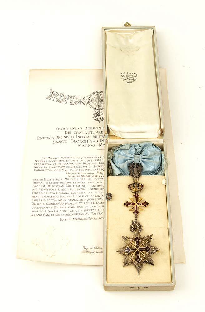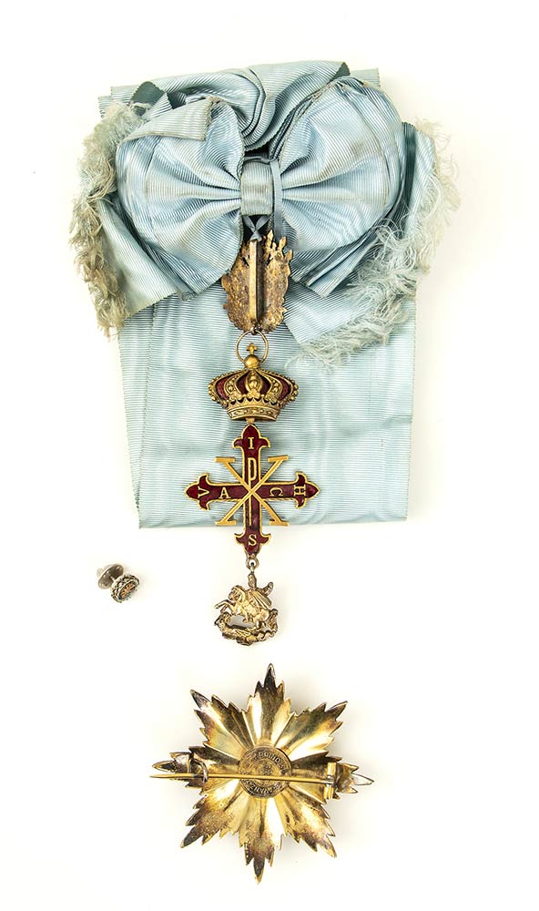 Placca con fascia e pendente in argento dorato con applicazioni di smalto rosso, trofeo militare e santo con fascia di seta marezzata celeste, conservata in astuccio, produttore Cravanzola, Roma concessa a membro della nobiltà romana come attesta il diploma di concessione