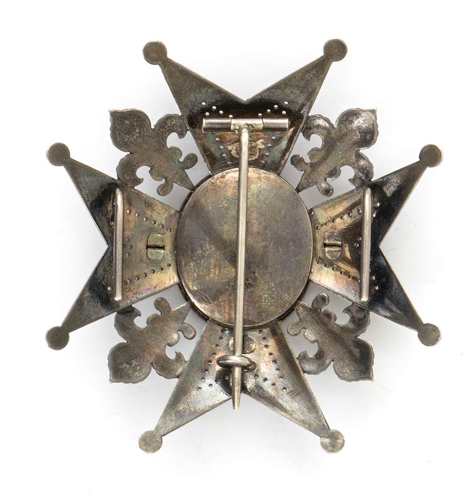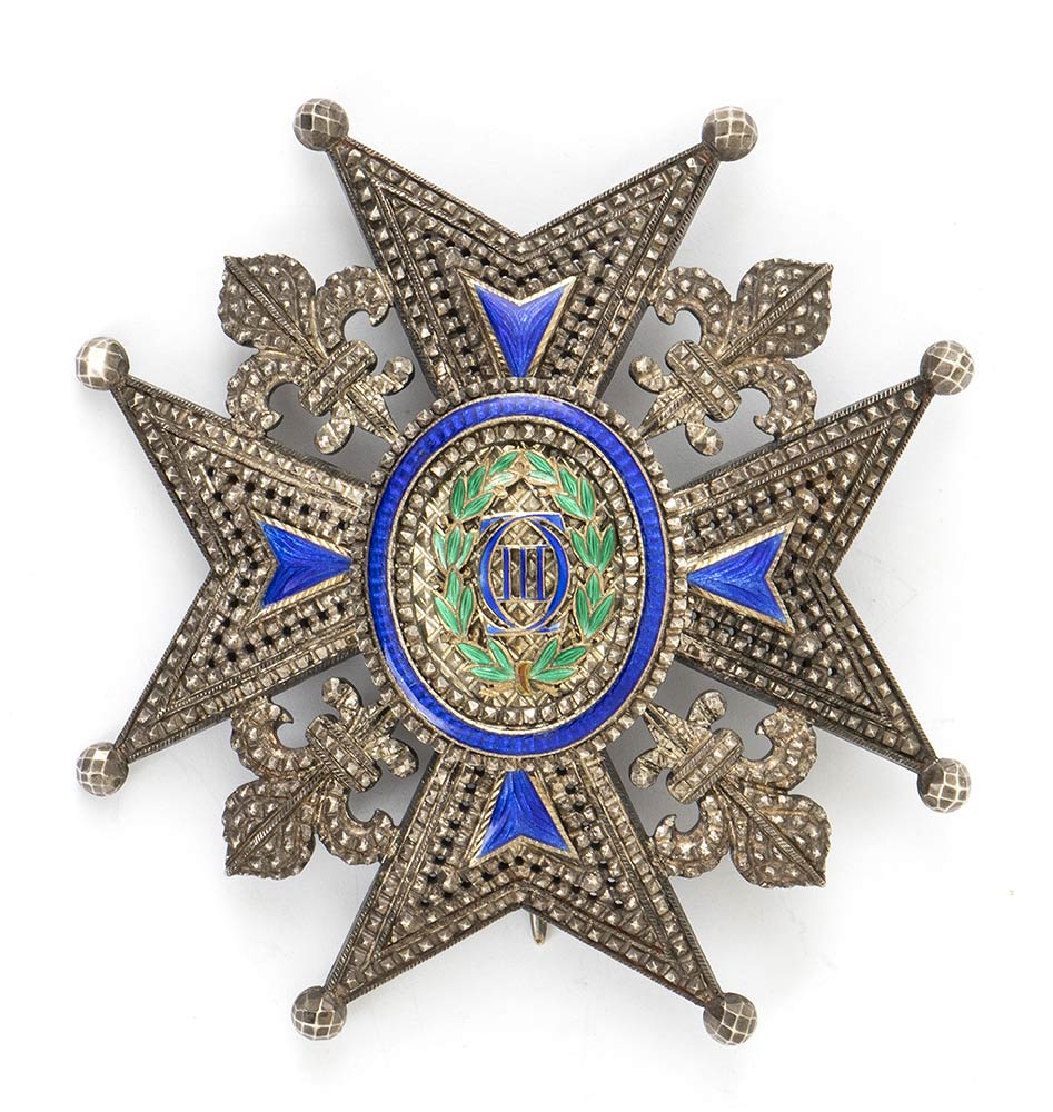 Ordine di Carlo III, placca da Commendatore di numero, periodo 1880 1900 , in argento e smalti, con foglie e monogramma in oro. Preziosa lavorazione, traforata ai bracci della croce, smalti integri, insieme in ottime condizioni. Misura mm.73x76 circa