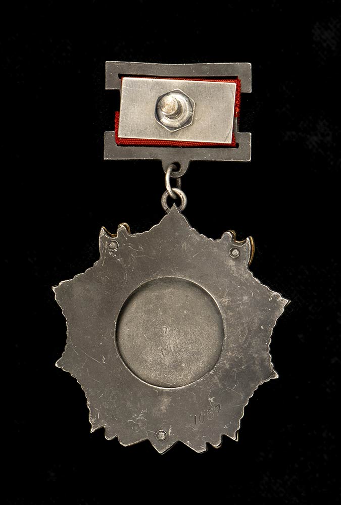 Rara insegna di primo tipo con nastro di sospensione, costruita in due pezzi rivettati, ed applicati a nastro di sospensione con dado marcato zecca di Dvor, n.1057 concesso nel1943, con la decorazione la tessera con annotate altre due decorazioni
