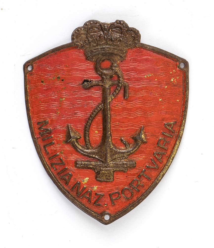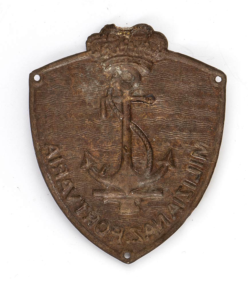 aro scudetto da braccio da milite della Milizia Portuaria, lamierino di ottone stampato e verniciato, croce alla corona mancante, altrimenti in buono stato
