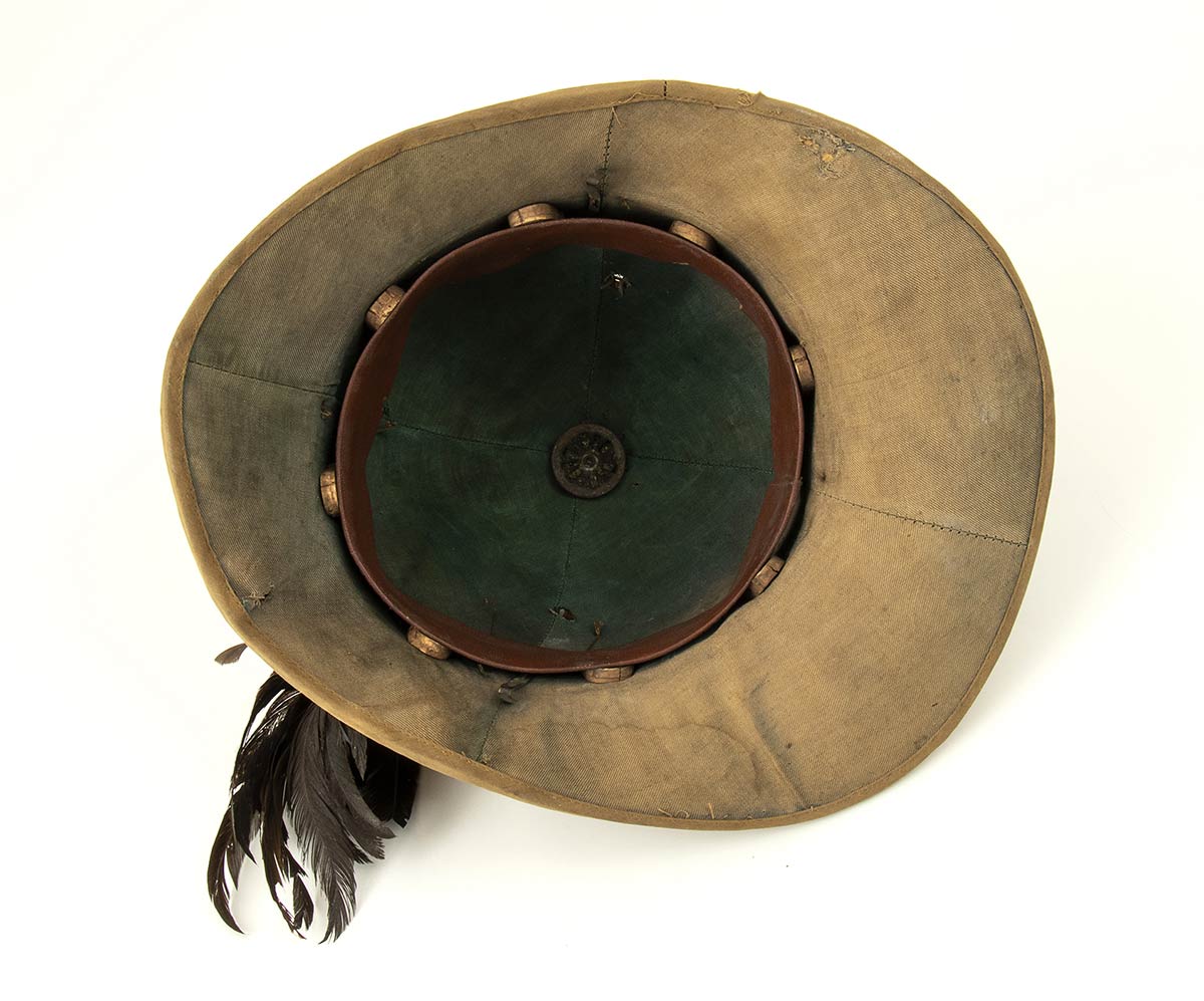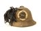 Sughero ricoperto di tela di cotone, coccarda di lana con fregio metallico e piumetto, rotture e mancanze, molto bello in quanto utilizzato effettivamente durante la guerra, in patina