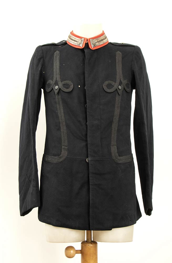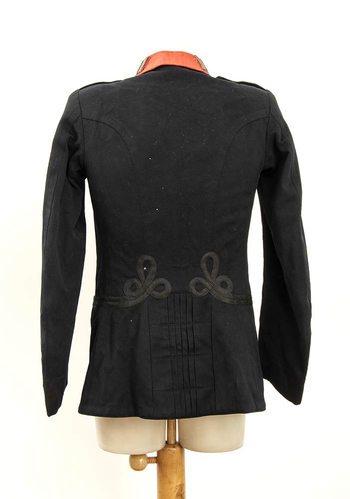 di grande taglia, panno nero con fiocchi di nastro alle tasche, collo rosso con alamari, leggere tarmature non deturpanti