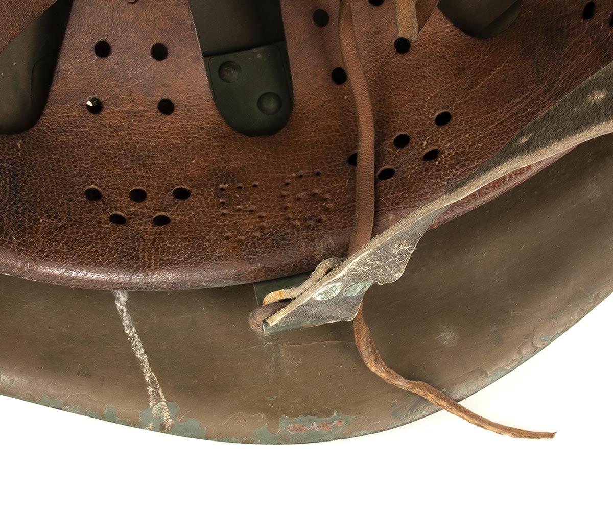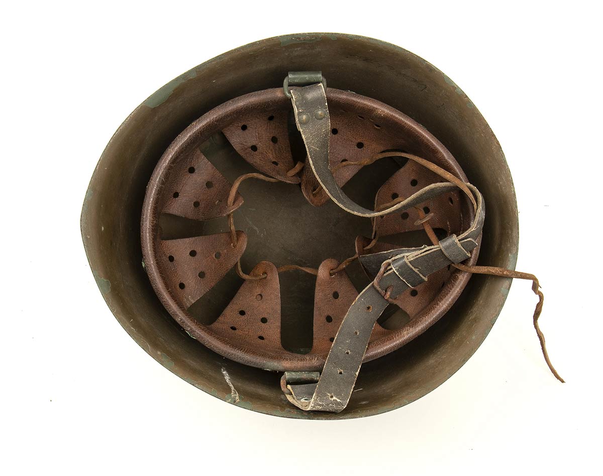 Elmetto bellico con tinta caki e fregio di artiglieria campale eseguito a mascherina con vernice nera, bella imbottitura in pelle, completo di soggolo