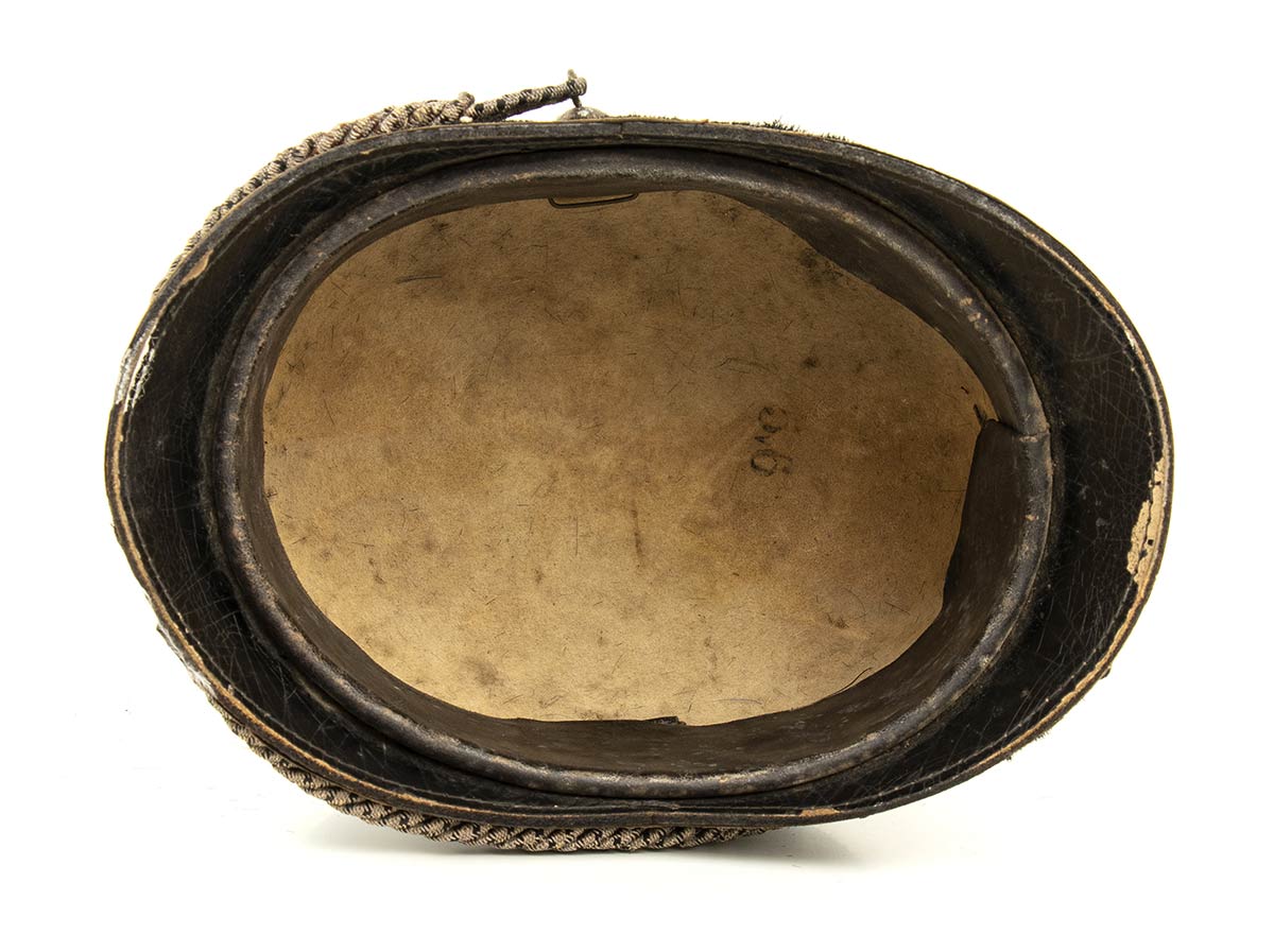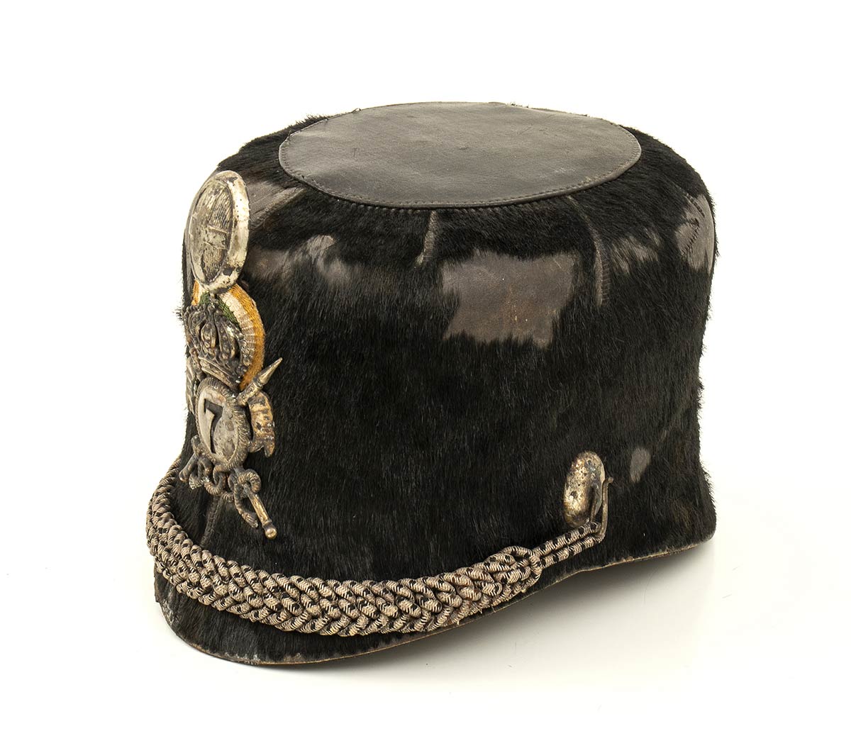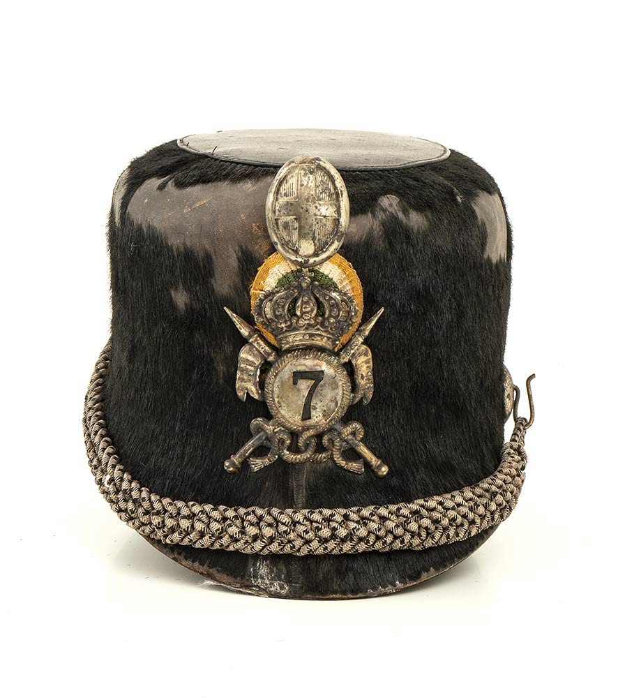 Fusto di feltro grigio ricoperto di pelo di cavallino con particolare treccia screziata, coccarda, fregio e nappina specifica, mancanze al pelo visibili in foto, bella forma, buono stato