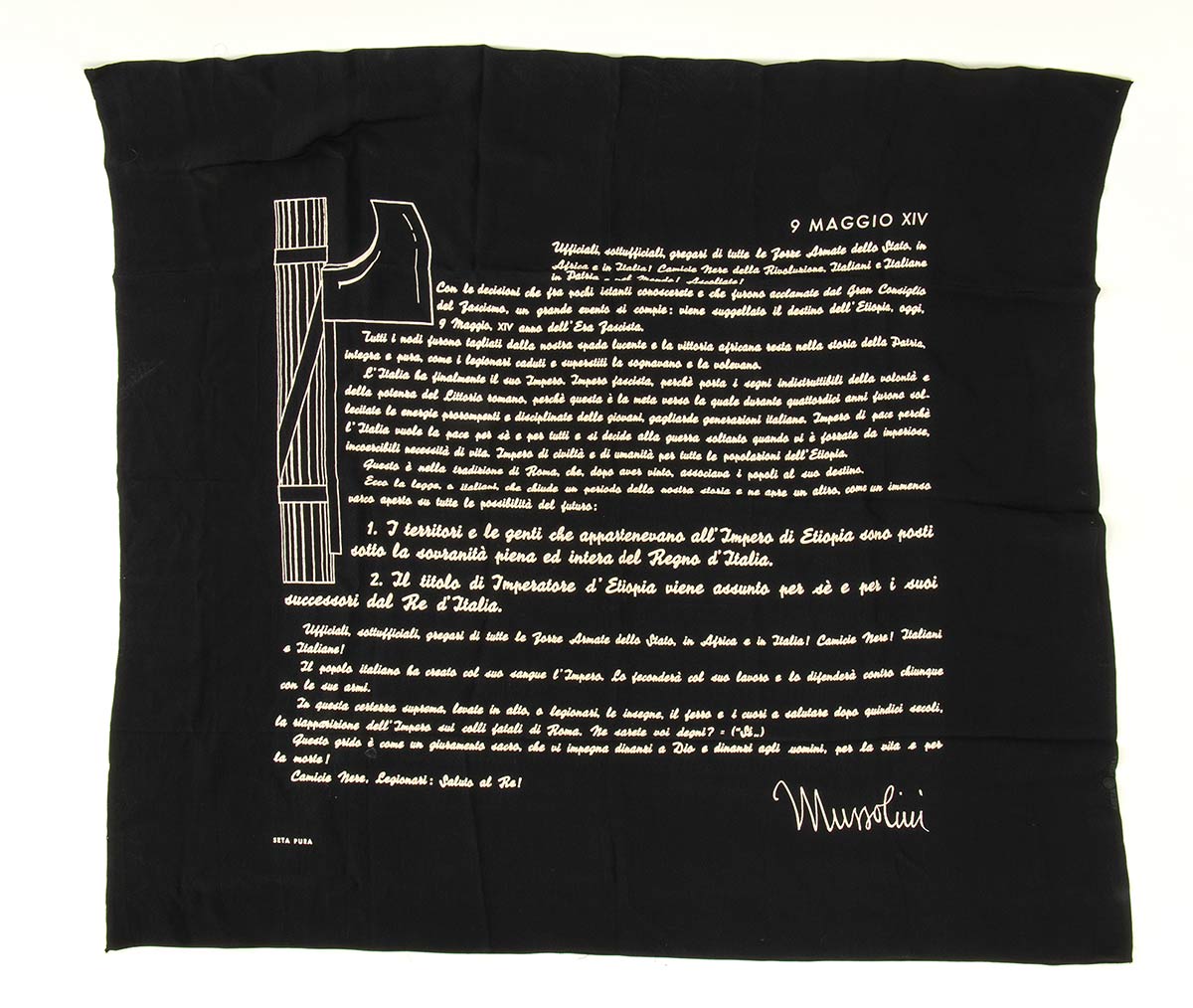 Fazzoletto in seta nera con impresso il discorso della proclamazione dell'Impero del 9 maggio 1936