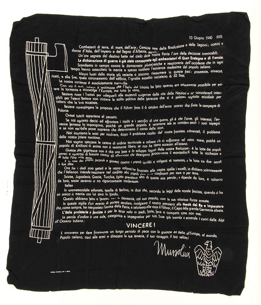 Fazzoletto in seta nera con fasci e discorso di dichiarazione di guerra a Francia ed Inghilterra del giugno del 40 in bianco