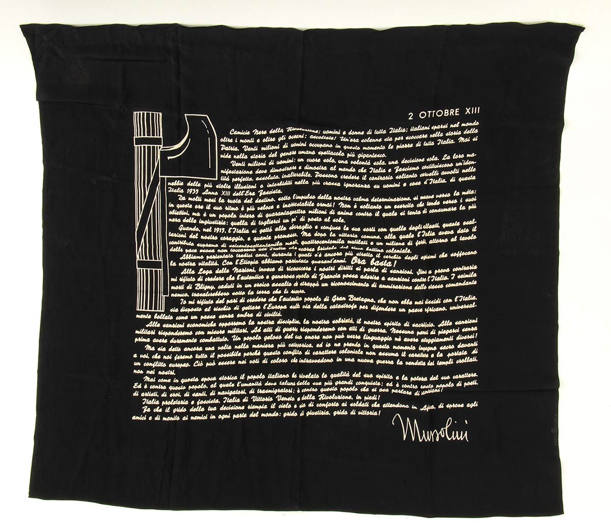 Fazzoletto in seta nera con impresso il discorso per l'inizkio delle operazioni militari in Etiopia del 2 ottobre del 1935