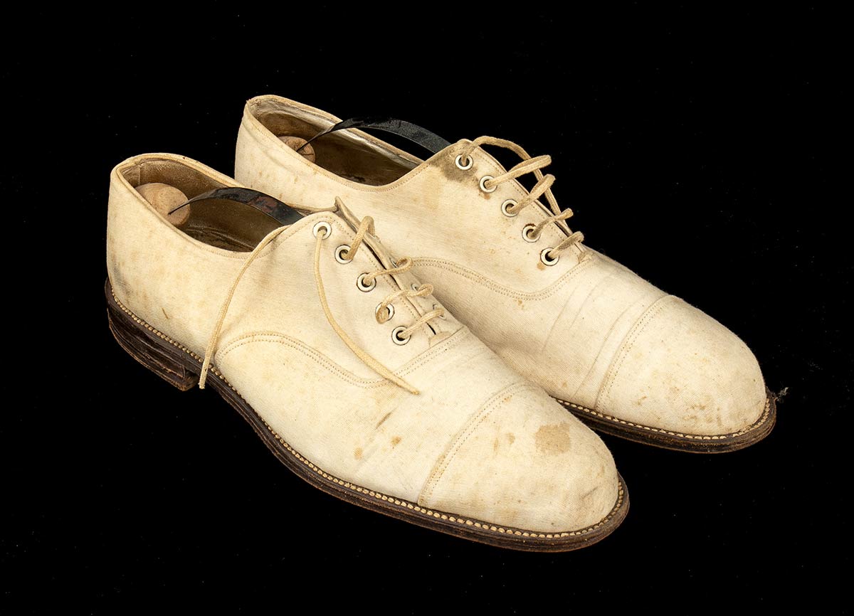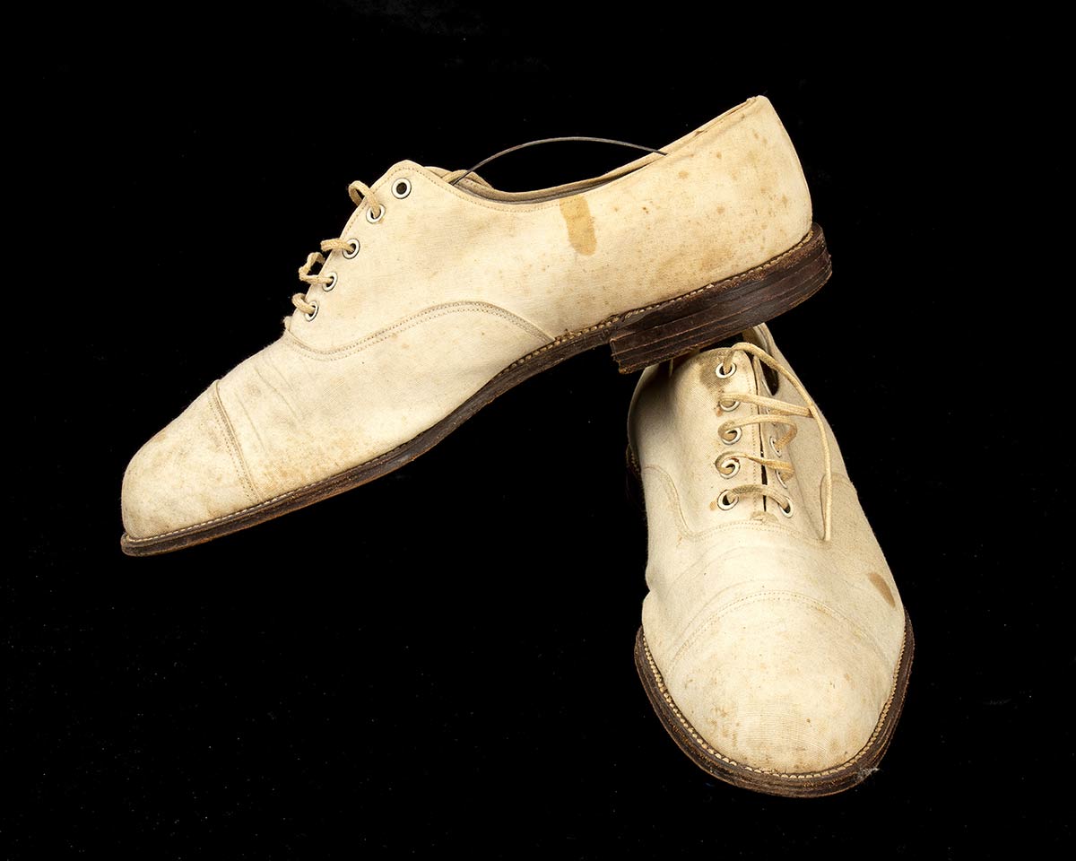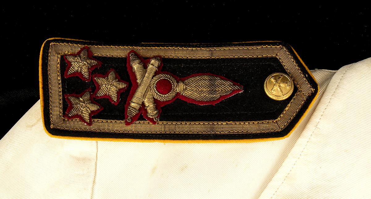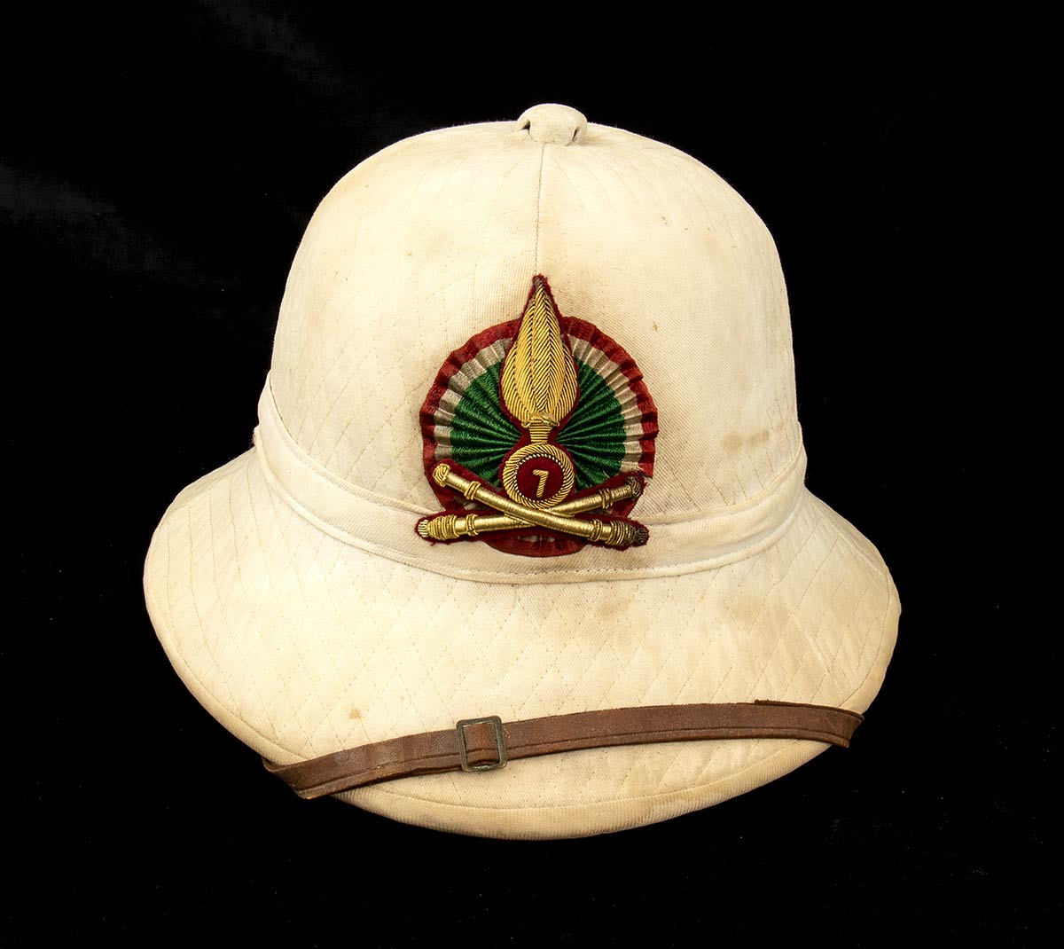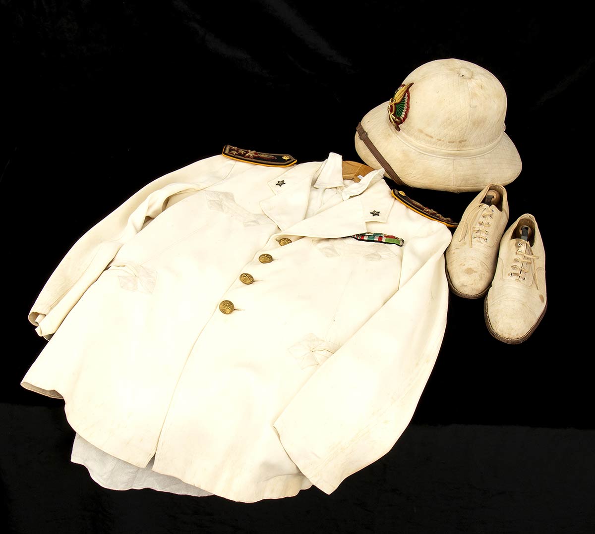 Bellissima uniforme composta da giacca bianca di seta m.1934 estiva con bottoni metallici e controspalline da colonnello comandante di artiglieria pesante campale con fregi ricamati in oro su panno rosso robbio, pantaloni, camicia in seta bianca di tipo regolamentare con apertura allo sterno,casco coloniale trapuntato con coccarda e fregio ricamato in oro su robbio, e rarissimo paio di scarpe bianche, di tipo regolamentare