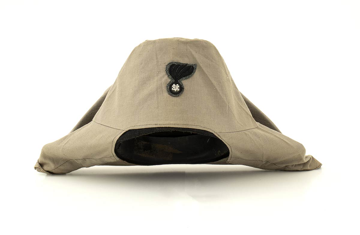 Telino mimetico su lucerna , la lucerna è totalmente sguarnita ed ha funzione di supporto del telino in tela di cotone con fregio ricamato di filo nero