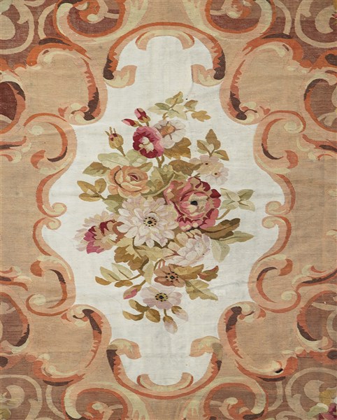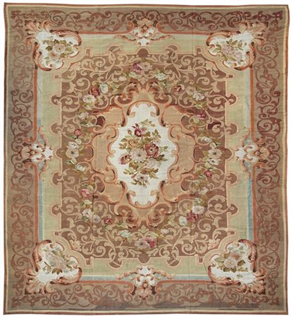 Tappeto Aubusson, Francia, seconda metà del secolo XIX. Decoro con bouquette di fiori centrale su fondo bianco. Campo decorato con volute e rami fioriti policromi su fondo bordeaux chiaro. Grande bordura con volute e fasce nei toni dell'azzurro e verde reseda (cm 484x393) (difetti, rapature e vecchi restauri)