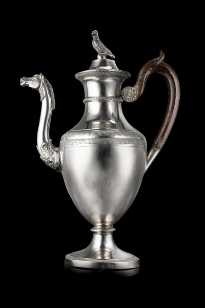 Caffettiera in argento a corpo liscio decorato a palmette, fiori e cifrato "AS". Presa del coperchio a pappagallo a tutto tondo. Versatoio a testa di cavallo e ansa in legno sagomato. Napoli, secolo XIX. Argentiere non identificato (g lordi 650) (cm 30) (difetti)