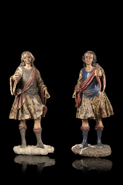 Coppia di sculture fiorentine reggitorciera in legno laccato e dorato raffiguranti fanciulli. Dipinte in policromia, poggianti su base in legno scolpito in forma di nuvola. Secolo XVIII (h. cm 132) (mancanze e restauri)