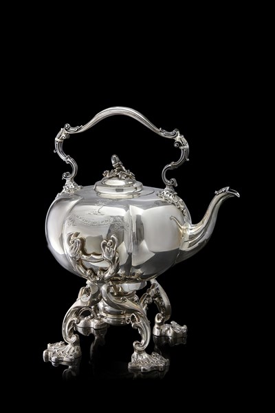 A silver kettle decorated with plant motifs. London, 1839. Silversmith Hunt Storr & Mortimer (h. cm 35) (g 2800)
