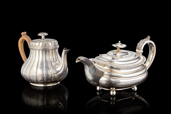 Lotto composto da due teiere in argento, una di forma bombata e scanalata, l'altra con fascia incisa e piedini a sfera. Londra, secolo XIX, argentieri differenti (g lordi 1300)