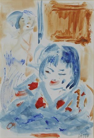 Sassu Aligi La Hostess, 1987 acquarello su cartoncino, cm 18x12,8 firmato in basso a destra, certificato di autenticità e provenienza Galleria La Scaletta - S. Polo di Reggio Emilia su fotografia, pubblicato su Catalogo "Il Disegno Italiano 16" al n. 71