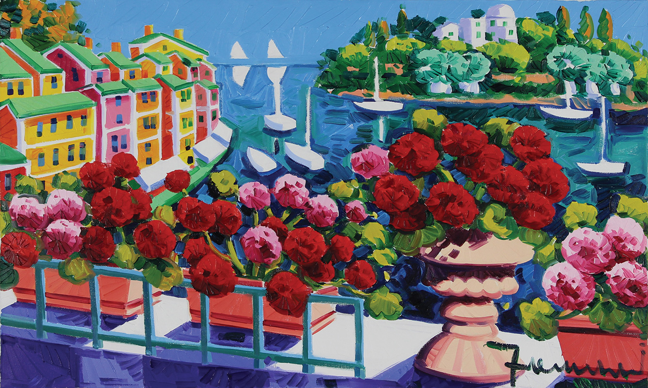 Faccincani Athos Vasi di gerani al primo sole, 2011 olio su tela, cm 30x50 firmato in basso a destra, firmato e intitolato al retro, autentica dell'artista su fotografia
