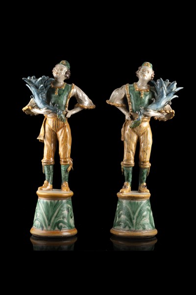 Manifattura di Caltagirone, secolo XIX "Coppia di figure popolari con cornucopi