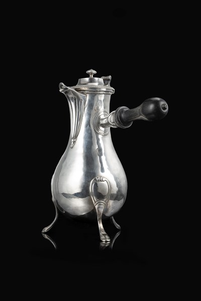 Cioccolatiera tripode in argento a corpo liscio con cifre "AD" incise. Fascia d