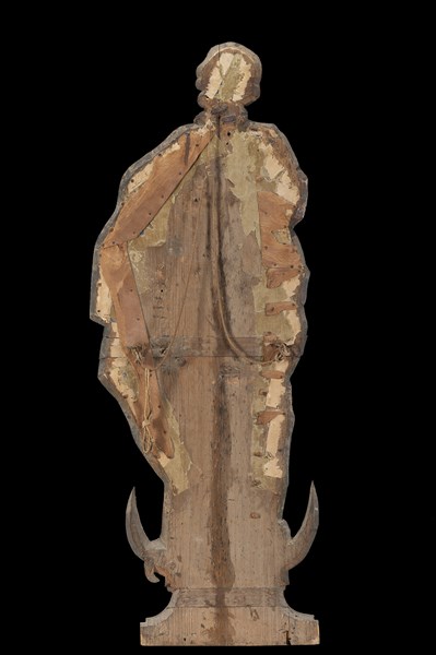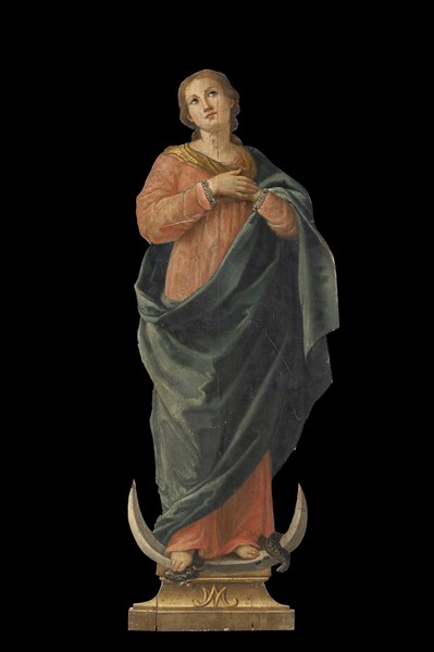 Silhouette raffigurante l'Immacolata dell'Assunta in legno dipinto con applicazioni in metallo dorato. Spagna, secolo XVI (h. cm 118,5) (restauri)