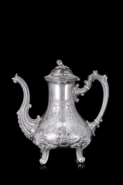 Caffettiera in argento con corpo piriforme parzialmente inciso a nastri e fiori, beccuccio e ansa a volute, presa del coperchio a frutto a tutto tondo, piedi a ricciolo. Ghiere in osso. Punzoni francesi, fine secolo XIX - inizio secolo XX (h. cm 24,5) (g lordi 680) (difetti)