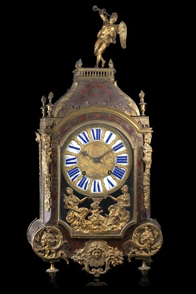 Ormolu clock decorated with "Boulle" motif. Ormolu dial with roman numerals. Two trains movement striking the hours and half. Marked. France, first half of the 18th century (h. cm 84) (defects and replacements)