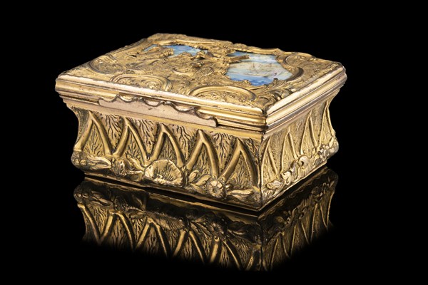 Scatola rettangolare in metallo dorato, sbalzato e cesellato. Decorata sul coperchio da Nettuno sul carro e una miniatura in smalti. Secolo XVIII (cm 8x3x6) (difetti)