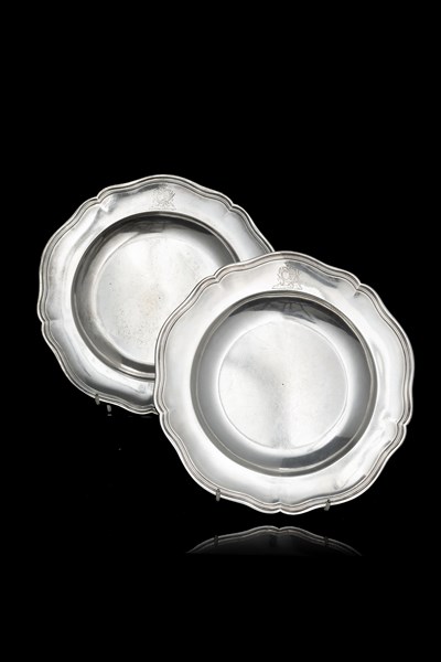 Coppia di piatti in argento con bordo traforato con inciso lo stemma da alleanza matrimonale con coronetta da marchesi. Francia, secolo XVIII (d. cm 25) (g 1200 ca.)