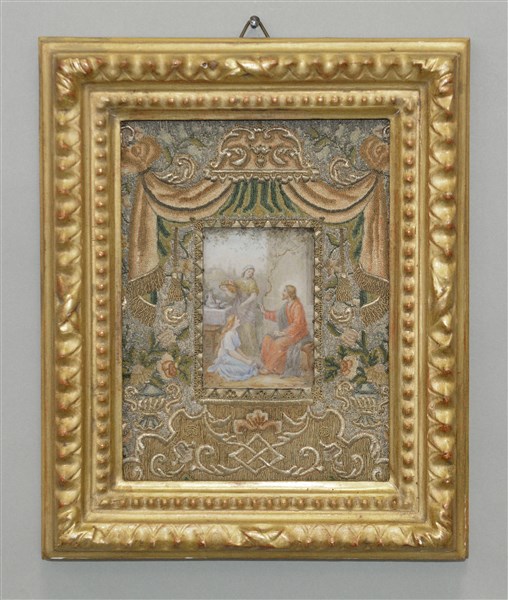 Miniatura del secolo XIX su pergamena raffigurante Gesù a casa di Marta e Maria. Cornice del secolo XVII realizzata con un ricamo in seta allucciolata, fili d'argento e fili d'argento dorato, con motivi raffiguranti una scenografia con tendaggi, baldacchino, vasi fioriti e volute (cm 17x10) (difetti)