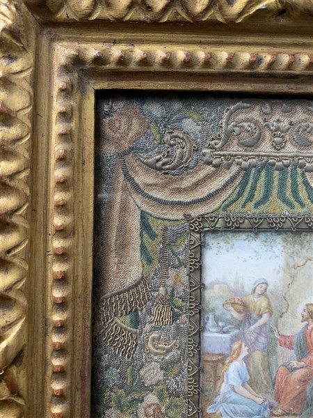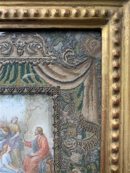 A 19th century miniature on parchment depicting Jesus at the home of Martha and Mary. Frame of the seventeenth century made with an embroidery in silk, silver threads and golden silver threads (17x10 cm) (defects)