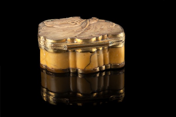 Scatola a profilo mosso con cerniera e profilo in metallo dorato, corpo in pietra gialla, coperchio in pietra scolpita a farfalla. Secolo XIX (cm 5x2,5x7) (difetti)