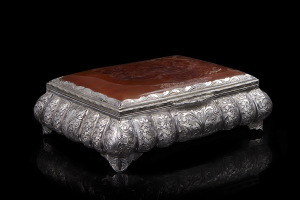 Scatola portagioie in argento cesellato a fiori e volute nella fascia. Coperchi