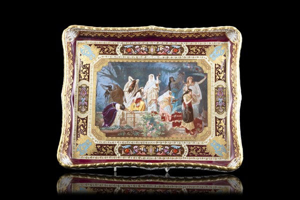 A late 19th-century Viennese manufacture porcelain tray. Signed Knouller (cm 37x30x6)