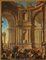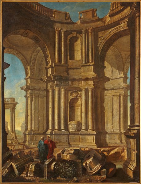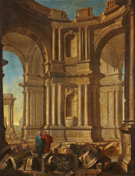 Scuola del secolo XVIII Capriccio con rovine architettoniche e figure Olio su