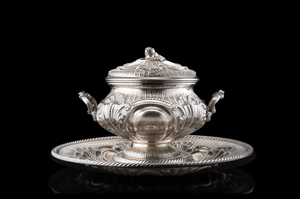 Zuppiera biansata con coperchio e vassoio in argento sbalzato e costolato a volute fogliate e conchiglie. Anse e presa del coperchio a guisa di fiori e frutto a tutto tondo. Titolo 800. Milano. Argentiere Ganci (h cm 22,5x28; d. vassoio cm 38,5) (g 2590) (lievi difetti)