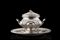 Zuppiera biansata con coperchio e vassoio in argento sbalzato e costolato a vol