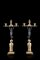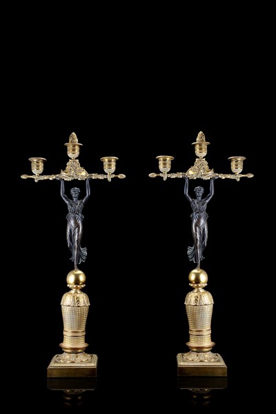 Coppia di candelieri a tre fiamme con porta candele cesellati a fiori sorretti da figure di vestali a tutto tondo in bronzo brunito. Basi a plinto decorate a foglie d'acanto. Secolo XIX (cm 23x50x10) (lievi difetti)