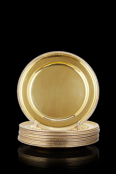 Gruppo di dodici piattini in vermeille con bordo a palmette. Titolo 800. Argentiere R. Miracoli (d. cm 21) (g 3430 ca.)