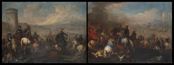 Battle scene near a tower; Battle scene between Turkish and Christian knights with siege in the background