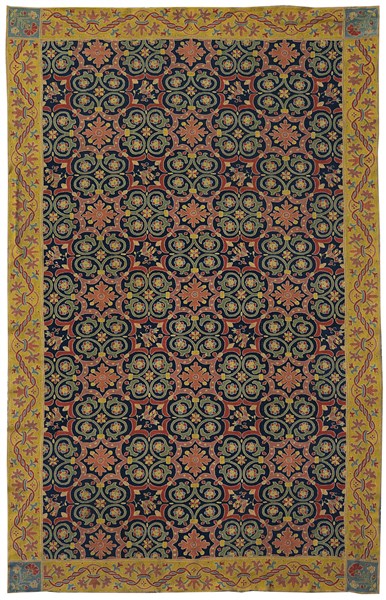 * Tappeto Arraiolos, Portogallo, secolo XVII/XVIII. Realizzato in lana con punto incrociato nella modalità tipica di questa provenienza. Decoro floreale con rami fioriti a formare riserve in cui è contenuta la colomba della pace. Il tutto su campo colore blu reale. Bordura a meandro con nastri intrecciati su fondo giallo. Ai quattro angoli un garofano rosso su fondo azzurro (cm 326x194) (difetti, piccole rotture e piccole macchie)