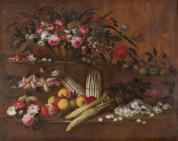 Still life with vase of flowers, fruits and vegetables