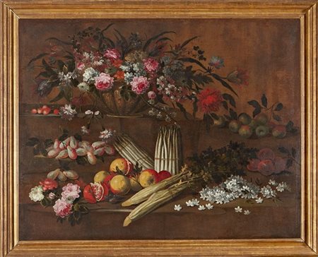 Composizione con vaso di fiori, frutta e verdure