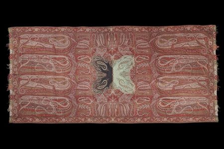 Scialle Kashmir, tessuto a mano in lana e seta con telaio a tiranti, Inghilterra, seconda metà del XIX secolo. Riserva centrale in lana e seta a due colori, nero e verde reseda, invasa da motivi a palmetta di varie forme e dimensioni che formano una sorta di medaglione. Decoro del campo con motivi a palmetta allungati che si intrecciano uno con l'altro in un tripudio di colori, ripresi nella bordura delle due testate (cm 345x160) (lievi difetti)