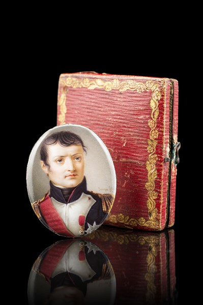 "Ritratto di Napoleone" miniatura ovale in smalti (cm 4,5x3,5) Firmata "Soiron Fils" a destra. In custodia in pelle impressa in oro (difetti)